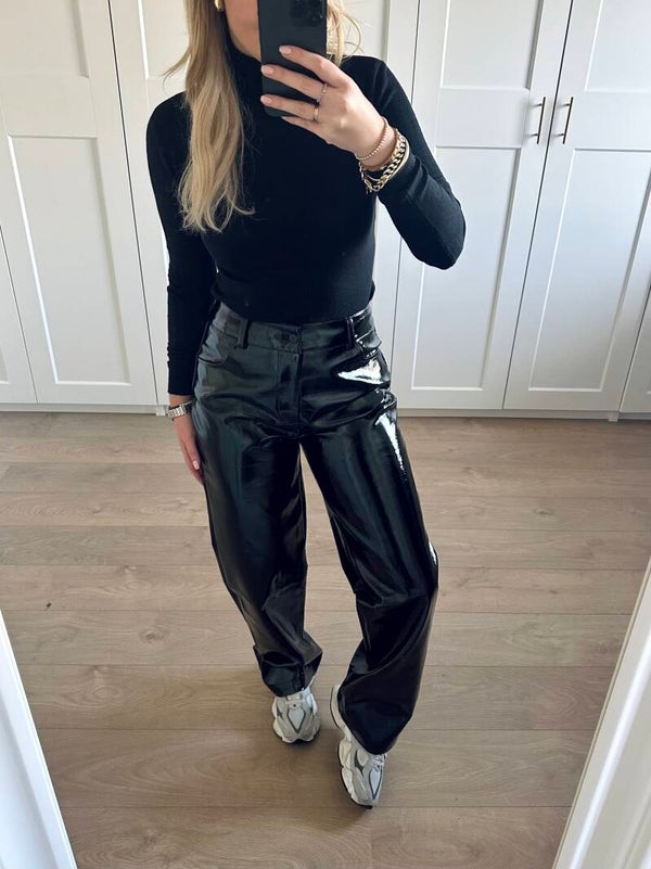 Hoe geweldig is deze nieuwe lak broek van Ambika? We're obsessed! De broek heeft een hoge taille met knoopsluiting.