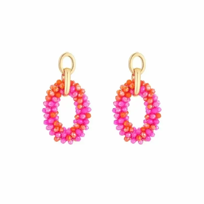 Leuke goudkleurige oorbellen met roze/oranje mix steentjes.