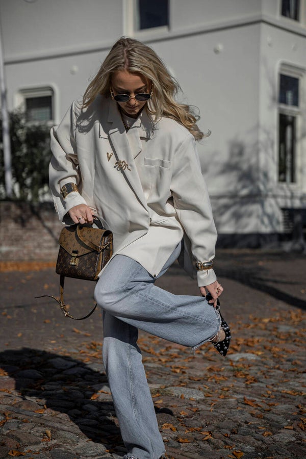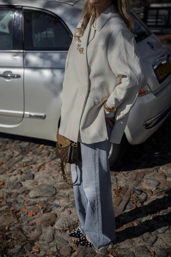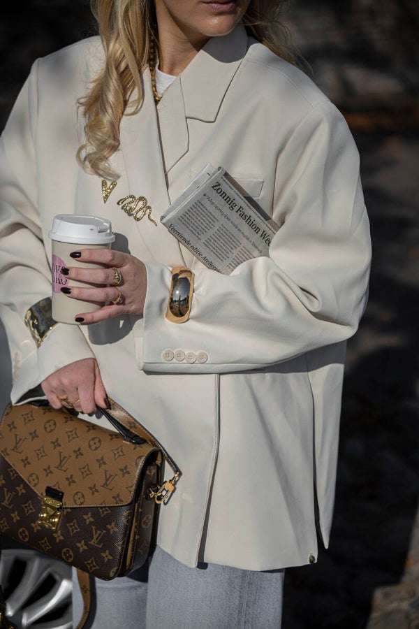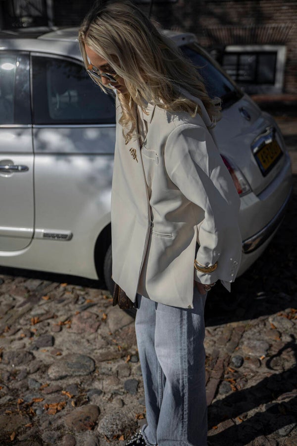 Onze oversized double-breasted blazer in creme is het perfecte statement piece voor een tijdloze en stijlvolle look. De blazer heeft een moderne, boxy fit met schoudervulling en is te sluiten met twee knopen.