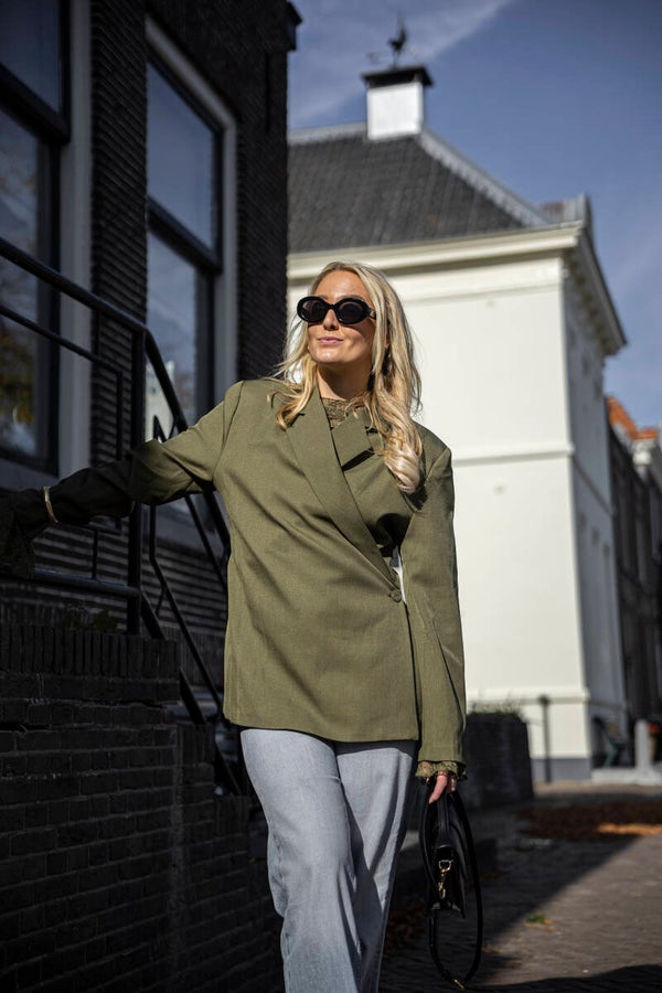 Hoe leuk is deze nieuwe oversized 'double breasted blazer'. Dankzij de langere fit kun je hem zowel als jurk dragen met een paar hoge laarzen, of combineren met een pantalon of jeans voor een stijlvolle everyday look. De blazer heeft een 'double-breasted' model met knoopsluiting, een strakke kraag en een licht getailleerde pasvorm die je silhouet mooi benadrukt.