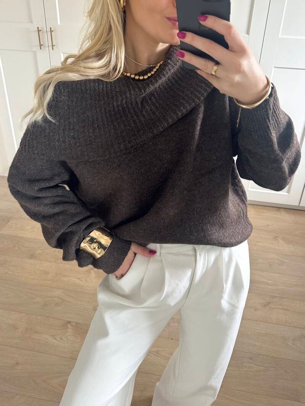 Off shoulder trui van zacht materiaal. De brede kraag valt subtiel over de schouders terwijl de gebreide textuur zorgt voor fijne comfort.