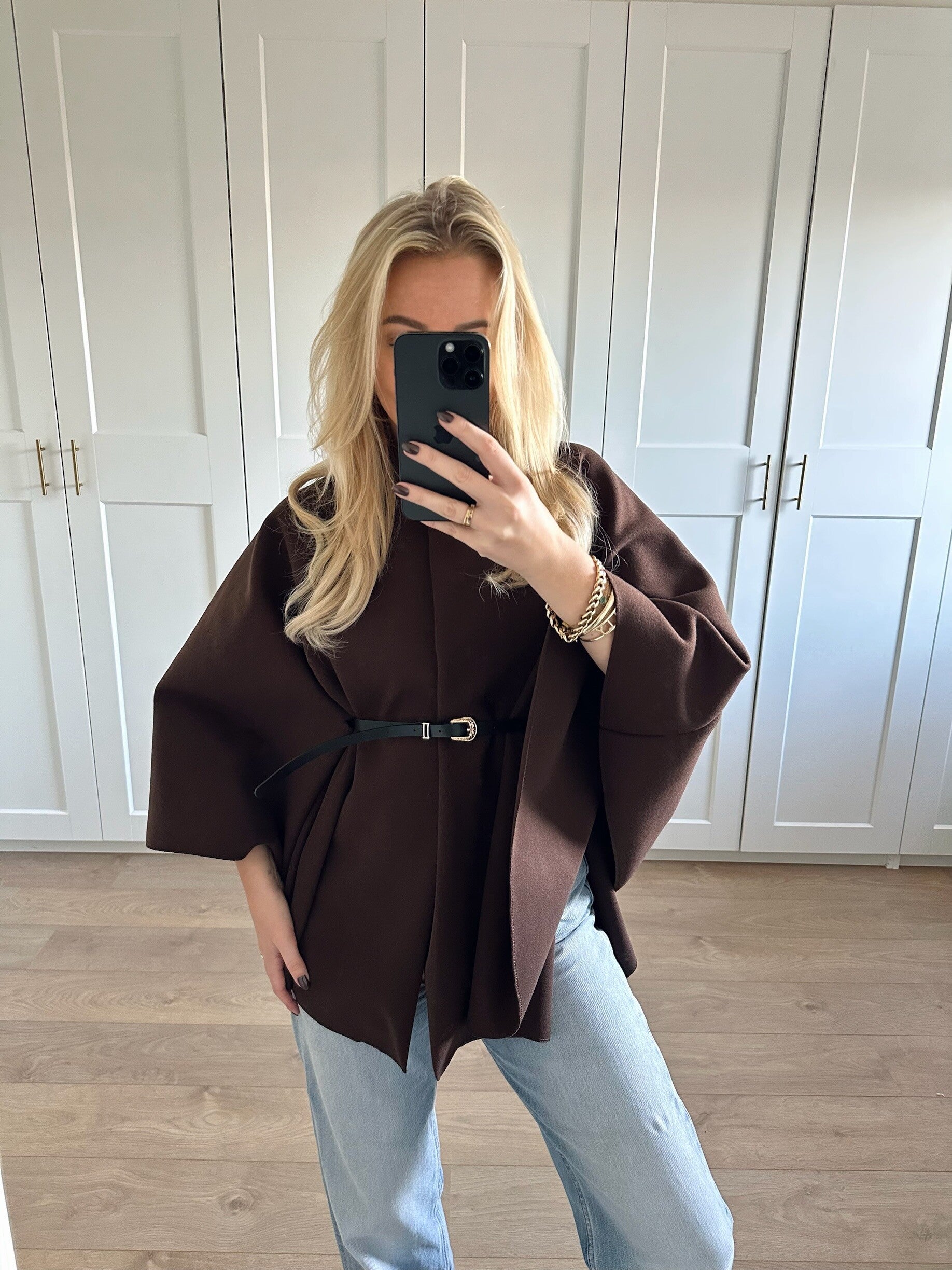 Leuke cape jas/poncho in een diepe chocoladebruine tint. De losse pasvorm met wijde mouwen geeft een chique, nonchalante look, terwijl de zwarte ceintuur in de taille zorgt voor een mooi silhouet. Afgewerkt met een goudkleurige knoop bij de hals voor een leuke touch.