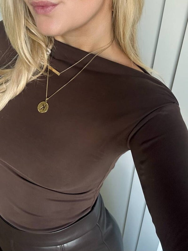 Mooie basic aangesloten top met boothals. De top valt strak. Bij twijfel raden wij aan een maatje groter te kiezen.