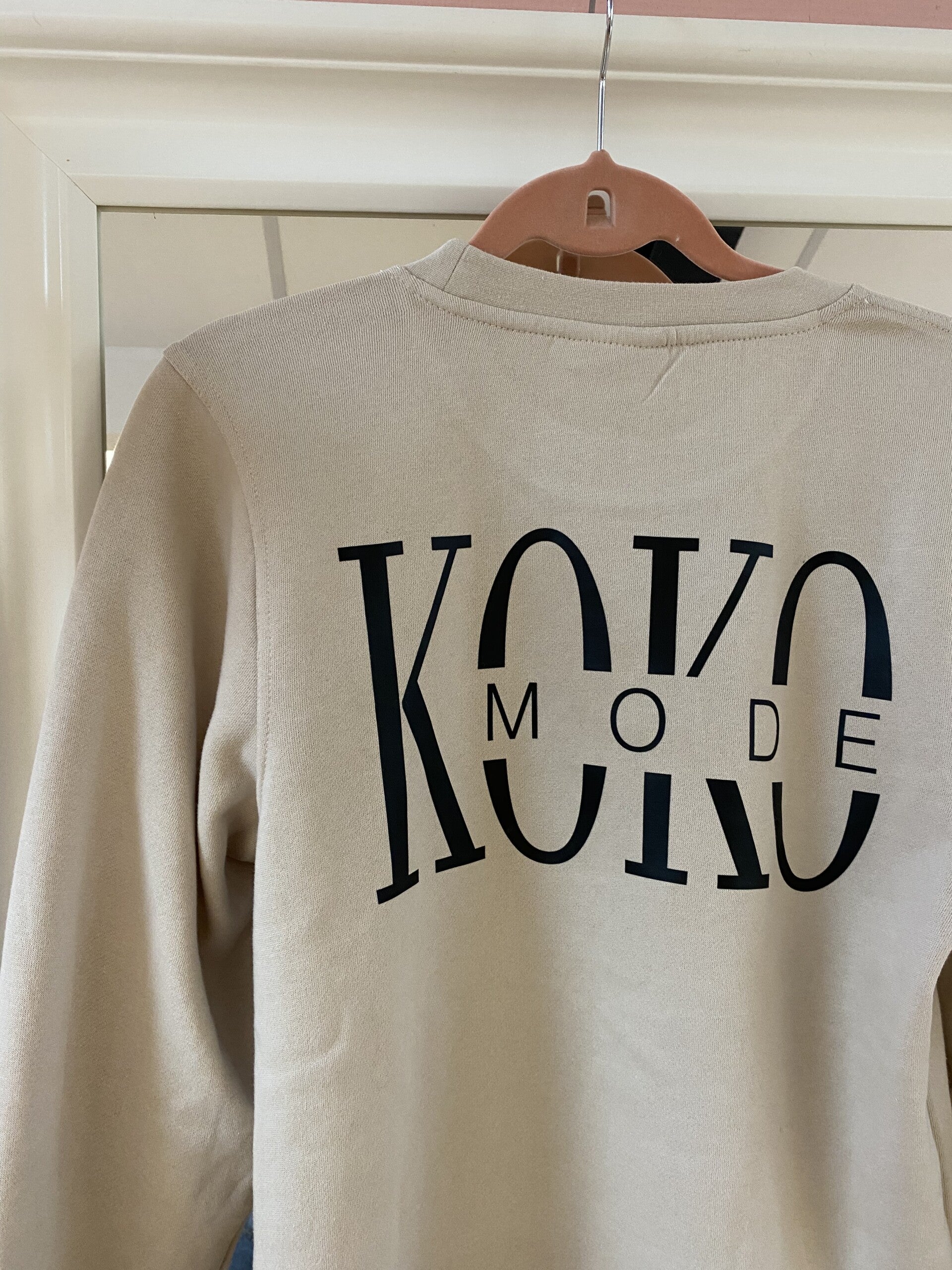 Fijne zachte ruimvallende sweater in het beige met zwarte KOKO-bedrukking op de linker borst en rug.